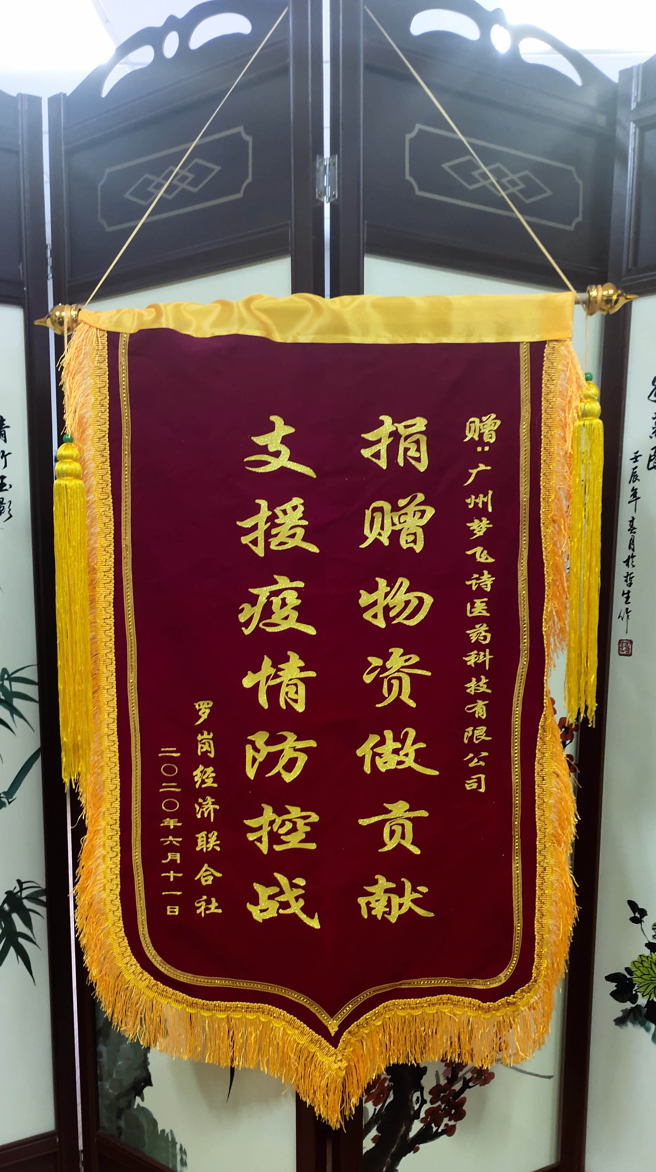 6月11日,廣州市白云區(qū)均禾街羅崗經(jīng)濟(jì)聯(lián)合社到本公司為公司防疫成績(jī)贈(zèng)送錦旗,感謝廣州夢(mèng)飛詩(shī)醫(yī)藥科技有限公司在新冠肺炎疫情發(fā)生期間積極配合社區(qū)所做出的無(wú)私奉獻(xiàn)。 疫情就是